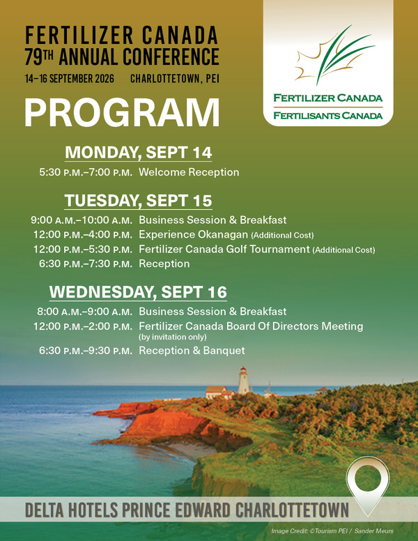 Fertilizer Canada is pleased to invite members to our 79th Annual Conference in Charlottetown, Prince Edward Island, from September 14 to 16, 2026.