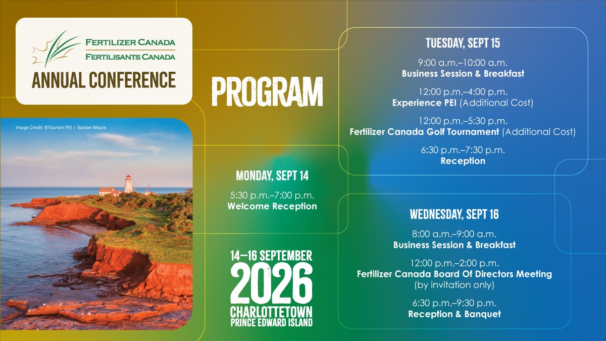 Fertilizer Canada is pleased to invite members to our 79th Annual Conference in Charlottetown, Prince Edward Island, from September 14 to 16, 2026.
